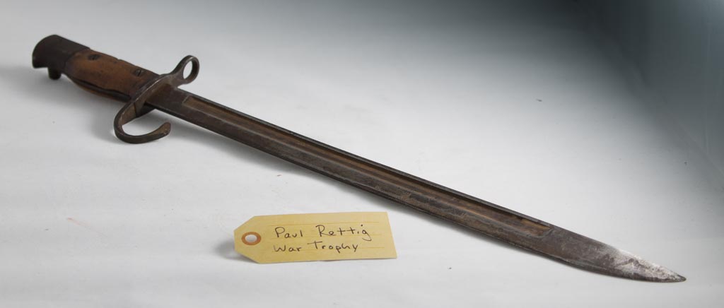 Hopefully I won’t get in trouble for this one, I think it might be illegal for me to carry this around. [Oh no! Is it a weapon?] It is a weapon. […] This is a Japanese bayonet, it’s a war trophy that my grandfather brought back from World War II. He didn’t kill anybody to get this, and hopefully nobody died so that he could have this. He was a quartermaster, so he didn’t carry a gun, he handled boxes to make sure supplies got to places […]. He bought this from a family after the war. This is a type 30 bayonet, they were made from about 1897 through the end of the war, and there were about 8.4 million made. This one is a rather rare model, it’s not one that was actually used in combat, this is a training model. […] This is something that would have come from a high school.