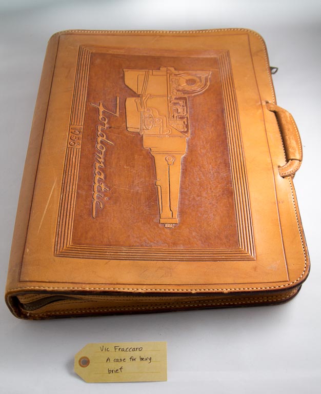 After coming to a few of these I thought I’d bring in something more personal. This was my grandfather’s briefcase. It’s a hand tooled leather briefcase… [B]ack in the 1950s, this is what you’d get when you retired after I-don’t-know-how-many years with the same company. My grandfather worked for Ford Motor, and hand tooled on this side is the Ford-matic transmission, which he worked on.