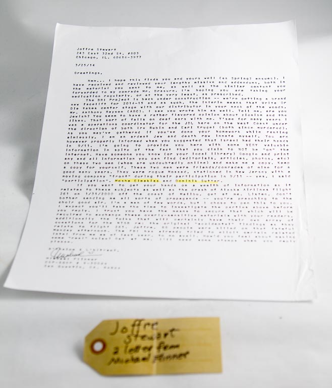 This is a letter from Michael Flinner; he’s in maximum security at a California Prison, maybe death row. […] He knows the two men connected with Mossad that who trucked in the explosives, which brought down buildings seven, two, and one in the World Trade Center. […] He wants me to go to the Internet and get the dope on them, and send it to him and he’ll get me more dope on Alaska Airlines flight 261 which crashed off Malibu, if you remember that news. Of course what he wants to tell me is not what you read in the newspaper or there wouldn’t be any point to it. […]