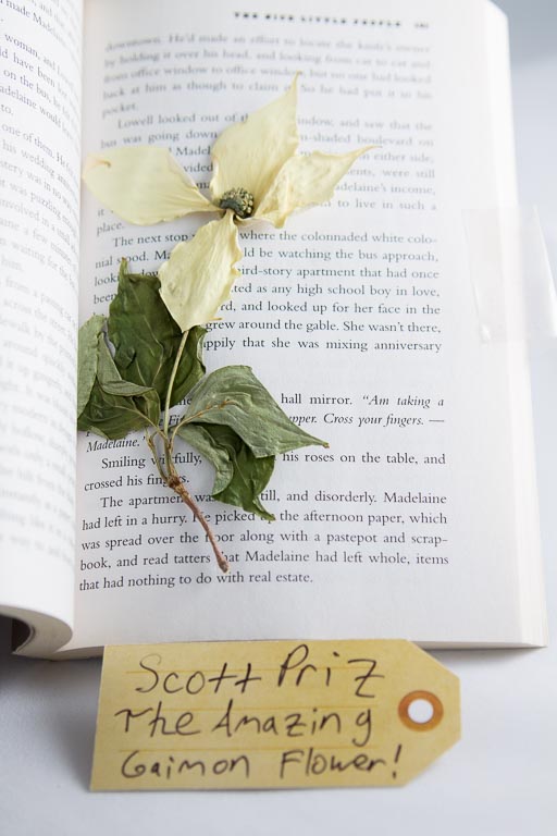 His wife had kept the flower until they met us…and…gave me the flower, just –I don’t know why. So I went home and I was reading this…Kurt Vonnegut book, “Look At The Birdie,” and I immediately put it in this book and…pressed it. It’s been about 3 years and I haven’t opened it since. Let’s see…oh -(opens to reveal flower, intact!)