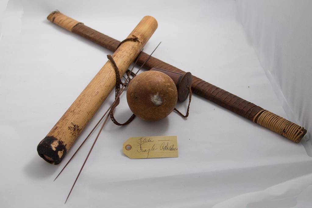 This goes back a little while ago; I was off in the jungles of Peru back about 200 years ago (it feels like that), but this is really a blow gun and this happens to be the quiver. What happened was I was going through South America from the top to the bottom and back up and I got to Peru and then went down the river that ends up being part of the Amazon, and got into this really small village…they make these [blow guns].