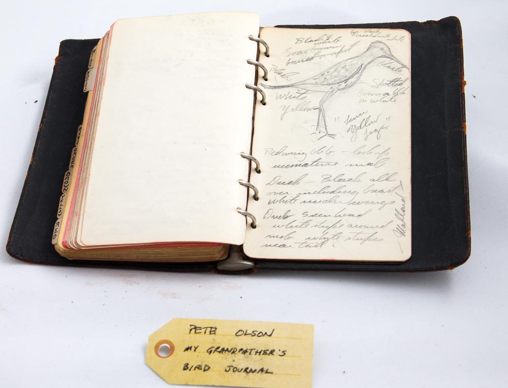 This book was put together by my grandfather who worked for the phone company in New York City, so this was a discarded handbook cover that they were throwing away, so he thought he would take it home and make his own book out of it. He was interested in birds, believe it or not, and he thought rather than spending money on a field guide for birds, he went to the library and got books out and typed up his own field guide to birds on this little paper with his little typewriter. […] There’s some odd code at the very top of the page… so what does that mean? 5.6 is how big this bird is. This by the way is a Black Coal Warbler. T means it’s transient, or migratory. 5 stands for the 5th month of the year, which is May, and E9-510 means early Sept through mid-October. […] This is something that my mom kept, and as I became interested in birds, she gave it to me. So it’s a family treasure. […] My dad did the same thing, and I discovered that only a few years ago. Lists of what birds he saw, when and where… And of course those of you who know me know I do the same thing as well, so it’s a weird genetic thing in my family, apparently.
