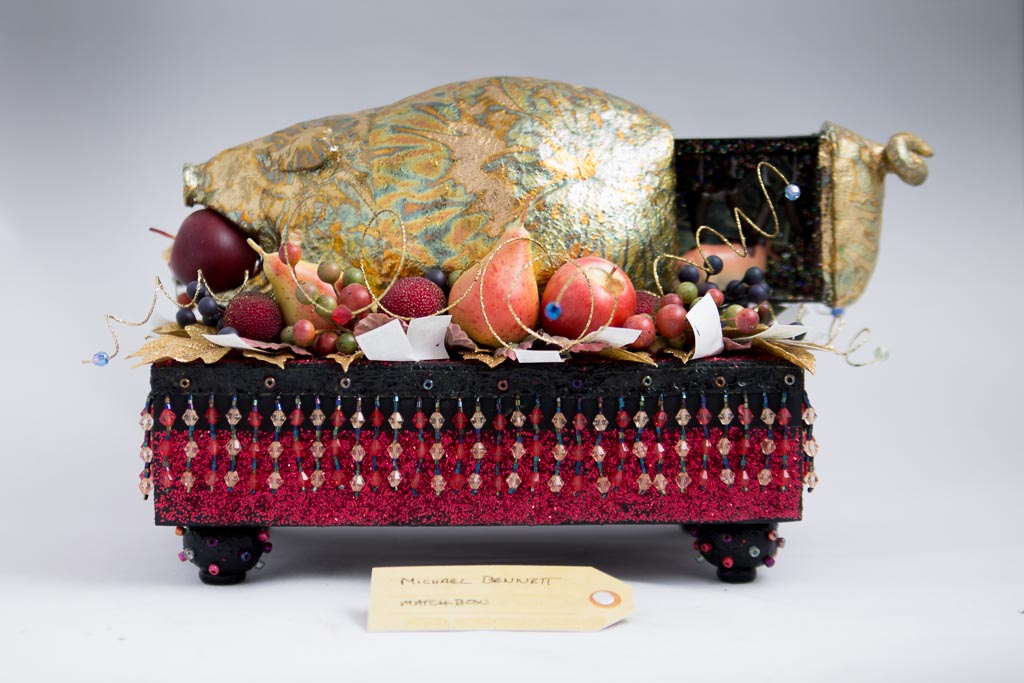 I had one student who went to town. She came up with this. This is a pig. Her family were hog farmers, so she did this and it is all over ‘eat pork, eat pork’. The matchbox is in the interior of the pig that she all-over gold foiled. This was done by Hattie Sanderson.
