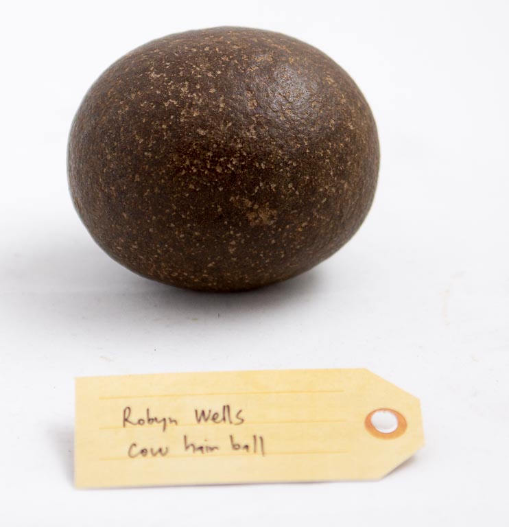 I come from a family of hobbyists and collectors, and the thing I brought is something that has been on display on top of my dad’s roll top desk for a long, long time. […] Our house is filled with fossils and all sorts of rocks, gems and minerals, and on top of the roll top desk amongst those crystals and things was this, and so I just for a long time assumed it was some sort of rock, and then I finally picked it up and realized how light it is […] so for the longest time then I just assumed it was an egg. And one time I mentioned to my dad the egg […] and he’s like, “That’s not an egg, that is a giant cow hairball.”