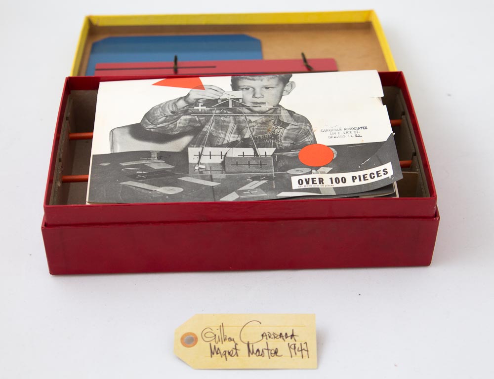 My recently deceased husband was an architect named Alfonso Carrara, and because my family was a generation younger than I, I really didn’t know that much about the Carrara family except for what my husband shared with me. They were immigrants that came here before 1900, they never knew how to read or write, except two sons of the family who were both architects in Chicago. I thought, “Hm, Okay… Arthur Carrara.” So I looked him up. And then I also was going through the archives of an immigrant family that lived in one house that they bought in 1920 […] and I was going through the excavation and I found Arthur Carrara’s Magnet Master. […] Arthur was an architect, but being an architect in the ‘40s/’50s/’60s, he was also an inventor. So with the then director of the Walker Art Museum, they developed these Magnet Masters for children 6 and under, but it’s very sophisticated.