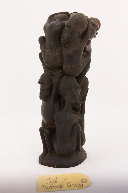 Several years ago, I can’t remember how long, but I was doing an overland trip from London to South Africa, and a friend of mine had said, “will you send me back a carving?” And I said, “Okay.” I didn’t know that much, and when I was in London I walked past a window and they were having a Makonde carving exhibit, and I said, “Geez that looks interesting and guess what? I’m going to be in Tanzania.” So when I got there we went to several of the carving families, and this is a Makonde carving. The Makondes probably started in about the 1700s, I think they started in the Congo, Zaire now, and then migrated over into Mozambique-in the northern part of Mozambique and then the southeastern part of Tanzania, which is where I bought this; and then due to political situations they moved up in Kenya. But a lot of the carvings were started in soft wood, so they don’t have very much history because most of those were done in by the termites. When they moved into this area, Tanzania, they started using the ebony tree which are much harder so the ants wouldn’t attack them. The carvings like this, you can see that there’s lots of people on top of this, this would be an ancestral. […] You can see that these are the ancestors here, and everybody lives on top of their ancestors, their past.