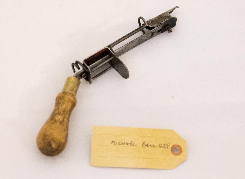 Last summer I was in Wisconsin, and I found one of these…and I thought, ‘what the hell is this?’ I was very intrigued because one part slides back and forth and it has a nice little point on it, and a little spiral at the end, but I was totally out of my realm. So I looked it up. It turns out that this is a blue nose rug hooker [for making rugs].