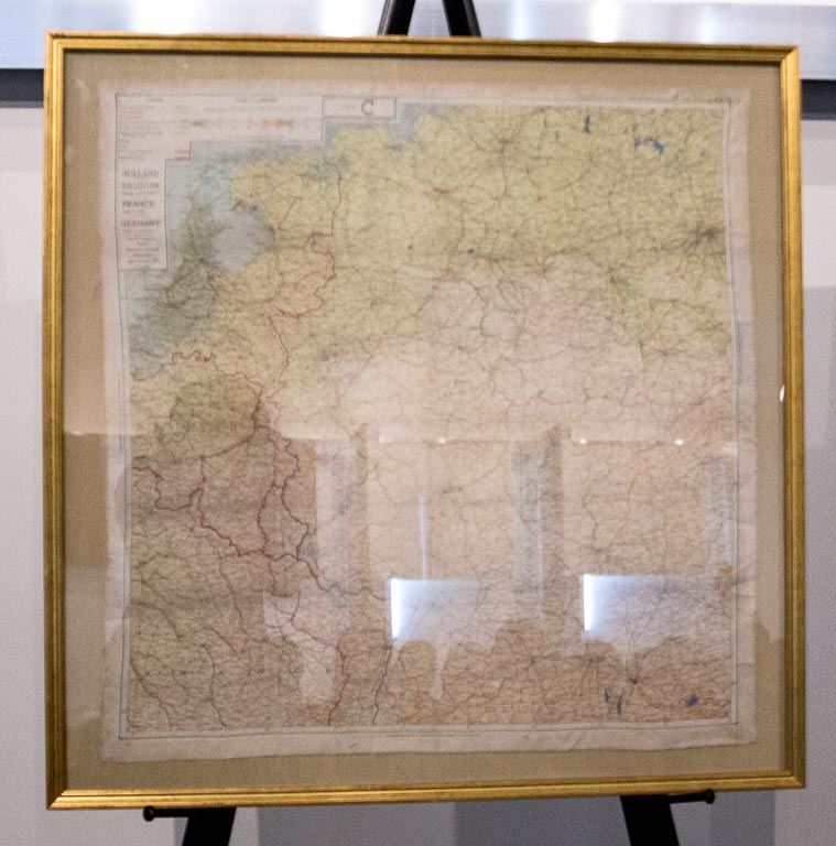 As they continued on their ship was hit. […] Smoke filled the plane so the instrument panel couldn’t be seen, and they had to turn out of formation. […] Then came the worst hit in the right wing, behind engine number four leaving holes throughout the plane. Chutes were grabbed and flight suits taken off as the crew prepared to bail out. […] By proper procedure my dad was the first one out of the plane, he left behind a 45 pistol but pocketed this silk map. […]