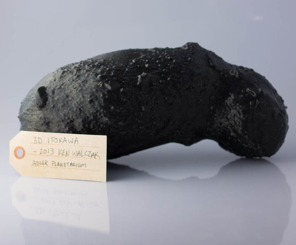 Something special happened a few weeks ago. [T]his is a model of an asteroid. It was an asteroid that was visited by a Japanese space craft a few years ago, it’s called Itokawa. And it’s not to scale. In fact, you’re from the Field which is good because I always use the example, it’s about 500 meters long, if you’re really there, and that’s about the walk from the Adler Planetarium to the Field Museum. So kids can kind of grasp that. […]