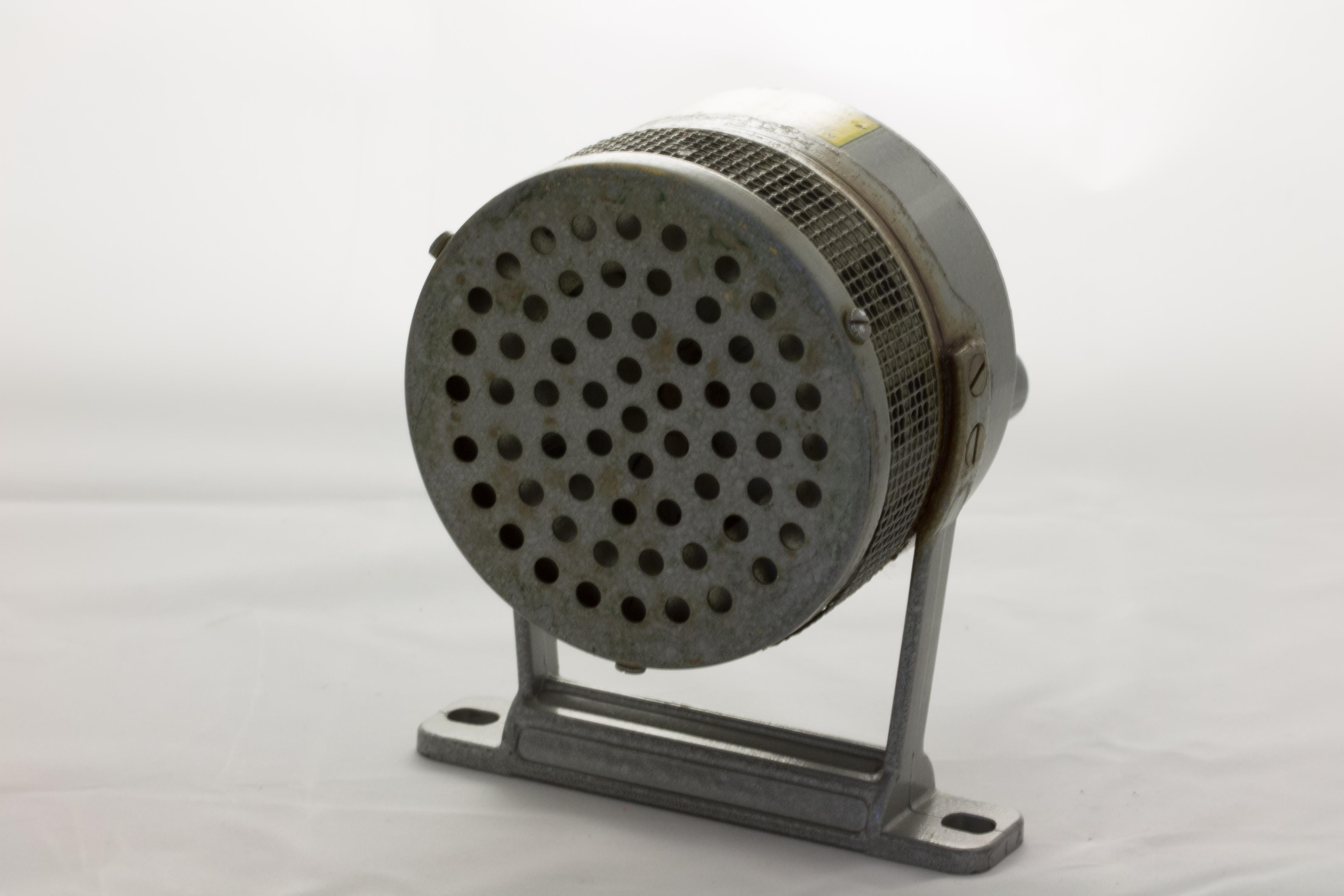 The Model G-Hand Siren is a product of the Federal Sign and Signal Corporation, a company founded in Chicago in the early 1900s. The Model G dates to the First World War although this particular siren was most likely made in the late 1950s. Cranking the handle causes the siren to emit a sound that would be familiar to most of its hearers.